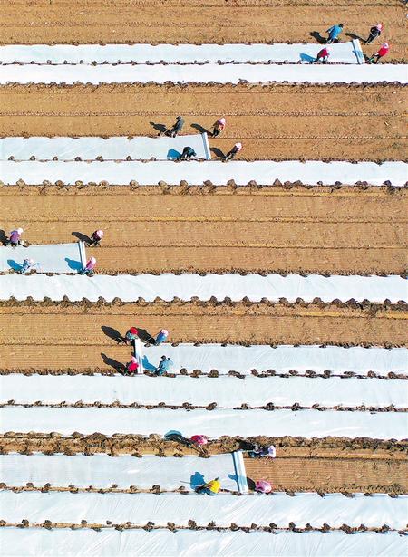 在甘州區(qū)上秦鎮(zhèn)綠鮮源供港澳蔬菜基地,菜農(nóng)搶抓晴好天氣,抓緊覆膜種植菜心。新甘肅·甘肅日?qǐng)?bào)通訊員 楊永偉