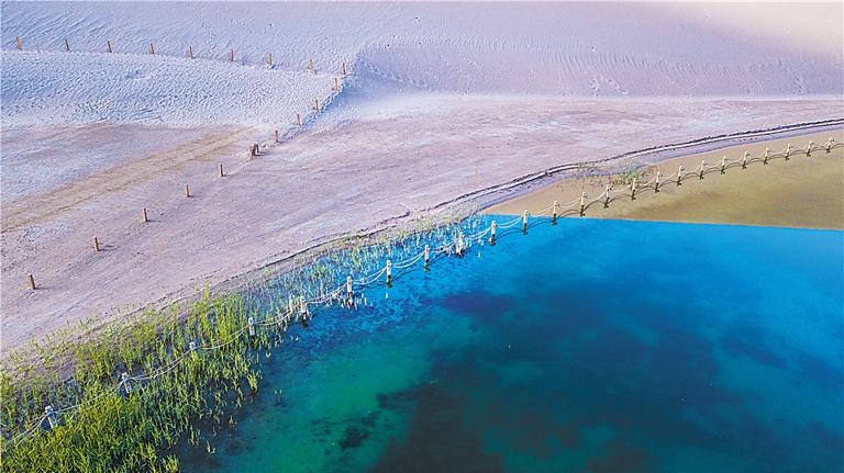 中國甘肅網4月28日訊 據蘭州晨報報道(奔流新聞·蘭州晨報記者荊雯 通訊員王斌銀)今年4月,敦煌氣候溫潤,雨水較多,鳴沙山月牙泉景區(qū)草木蔥蘢,月牙泉水位持續(xù)上升。從4月23日在月牙泉航拍的圖片可以看出,月牙泉水域面積逐漸擴大,泉水已滲出月牙泉圍欄之外近1米的距離。