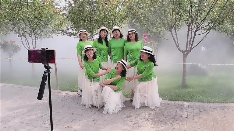 上午9時30分,水池中漸漸漫出淡淡的煙霧,時而稀薄,時而濃厚,隨著陣陣微風(fēng)飄蕩在小橋流水間。“準(zhǔn)備放音樂,我在原地來回轉(zhuǎn),你用手機(jī)豎屏拍。”……記者穿梭于人群間,這樣的聲音不絕于耳。“姐妹花”龔大姐和田大姐身穿正裝,各自圍上了顏色艷麗的圍巾,正站在鏡頭前直播。“這里非常美,像仙境一樣。綠化也做得特別好,公園里的綠植和鮮花種類繁多,很好看。我們是第一次來,希望蘭州多打造一些這樣的美景。”