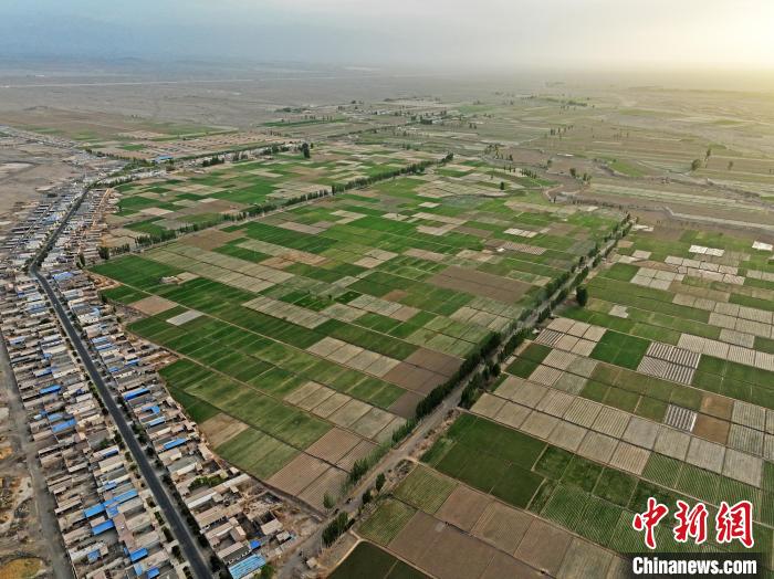 圖為航拍鏡頭下的戈壁田園?!∴嵰?nbsp;攝
