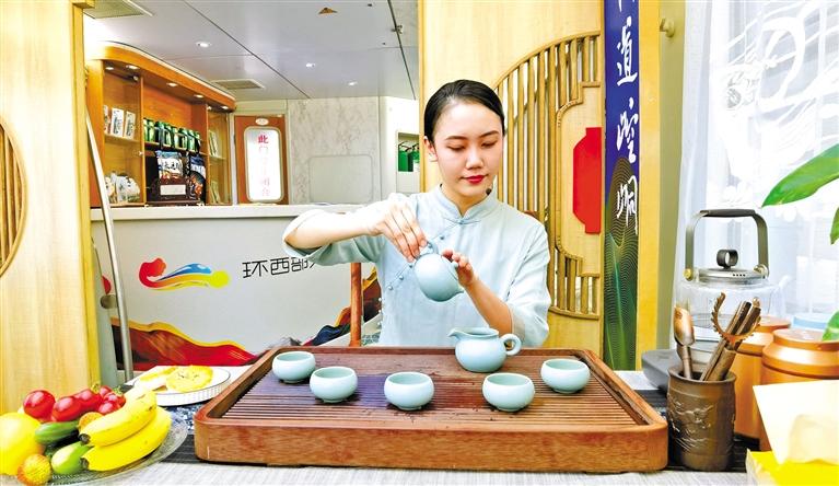 這趟列車由6節(jié)軟臥車廂、1節(jié)餐車、1節(jié)休閑娛樂功能車組成,車體內(nèi)外隨處可見平?jīng)鑫幕糜卧?。記者在車廂?nèi)看到,崇信龍泉寺、華亭安口窯古村落、靜寧仙人峽……每一間軟臥門上都是絕美的平?jīng)鲲L(fēng)光大片,整個車體儼然移動的“平?jīng)鑫穆谜桂^”,讓人“身未動,心已遠(yuǎn)”。車體中部的功能車,更是顛覆了以往人們對火車的認(rèn)知,麻將桌、功夫茶、全套的K歌設(shè)備,還有平?jīng)鎏厣穆蒙唐?、農(nóng)特產(chǎn)品展銷區(qū),平?jīng)鑫穆脮営[區(qū)、平?jīng)鑫幕黝}報刊欄,足以打發(fā)游客在旅途中的無聊時光。餐車也極富特色,車廂頂部裝飾有色彩豐富的藻井圖案,飛天仙子衣袂飄飄、環(huán)繞四周。“在這樣的餐車上吃飯,吃的那是品位。”一位乘客開心地和同行的伙伴說著。62歲的張女士一到平?jīng)鼍兔Σ坏亟o女兒發(fā)微信,“火車上住得舒適,服務(wù)好,環(huán)西部火車游·崆峒號很超值!”
