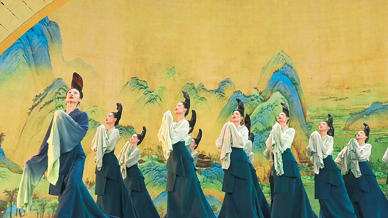 圖為圍繞傳世名作《千里江山圖》創(chuàng)排的舞蹈詩(shī)劇《只此青綠》亮相2022年中央廣播電視總臺(tái)春節(jié)聯(lián)歡晚會(huì)(視頻截圖)。 中央廣播電視總臺(tái)供圖