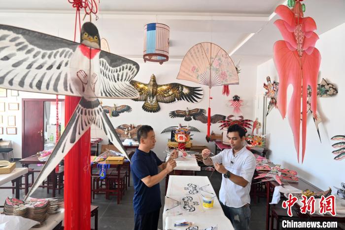 巴基斯坦籍留學(xué)生烏瑪爾(右)跟隨第什里風(fēng)箏第五代傳承人趙艷強(qiáng)(左)學(xué)習(xí)傳統(tǒng)風(fēng)箏制作。 翟羽佳 攝
