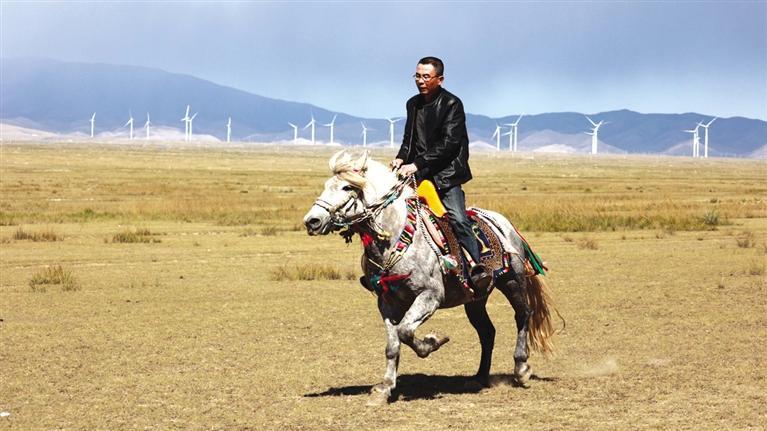 驅(qū)車向草原腹地進發(fā),遠遠就能看見有人在馴馬。馴馬者房利軍和他的坐騎“尕青”仿佛“人馬合一”,同呼吸、共步調(diào),一遍遍練習(xí),像走,更像飛。這便是傳說中的走馬文化,和跑馬的加速度不同,走馬不管是走還是跑,都是快步勻速,短途速度快,長途耐力強,騎乘平穩(wěn),姿態(tài)優(yōu)美,觀賞性強。在牧區(qū),走馬實用性強,深受當(dāng)?shù)厝藲g迎。曾有專家稱,“馬踏飛燕”的“馬”即為走馬。每天,和武威天祝一山之隔的這片草原,都與房利軍有關(guān),在這里,他專心馴馬,而他的500只羊則在一旁撒歡。尤其從高空俯瞰,草原牧羊的畫面甚是壯觀??赐犟Z馬,房利軍騎馬帶路,采訪車沿著馬道回到了“家”。