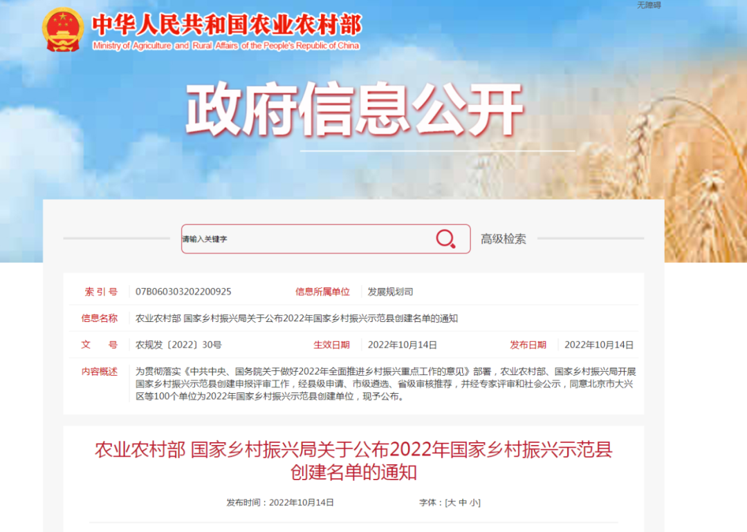 農(nóng)業(yè)農(nóng)村部、國家鄉(xiāng)村振興局開展的國家鄉(xiāng)村振興示范縣創(chuàng)建申報評審工作近日完成,北京市大興區(qū)、河南省蘭考縣、四川省眉山市東坡區(qū)等100個單位為2022年國家鄉(xiāng)村振興示范縣。其中甘肅省會寧縣、民勤縣、臨澤縣三地上榜。