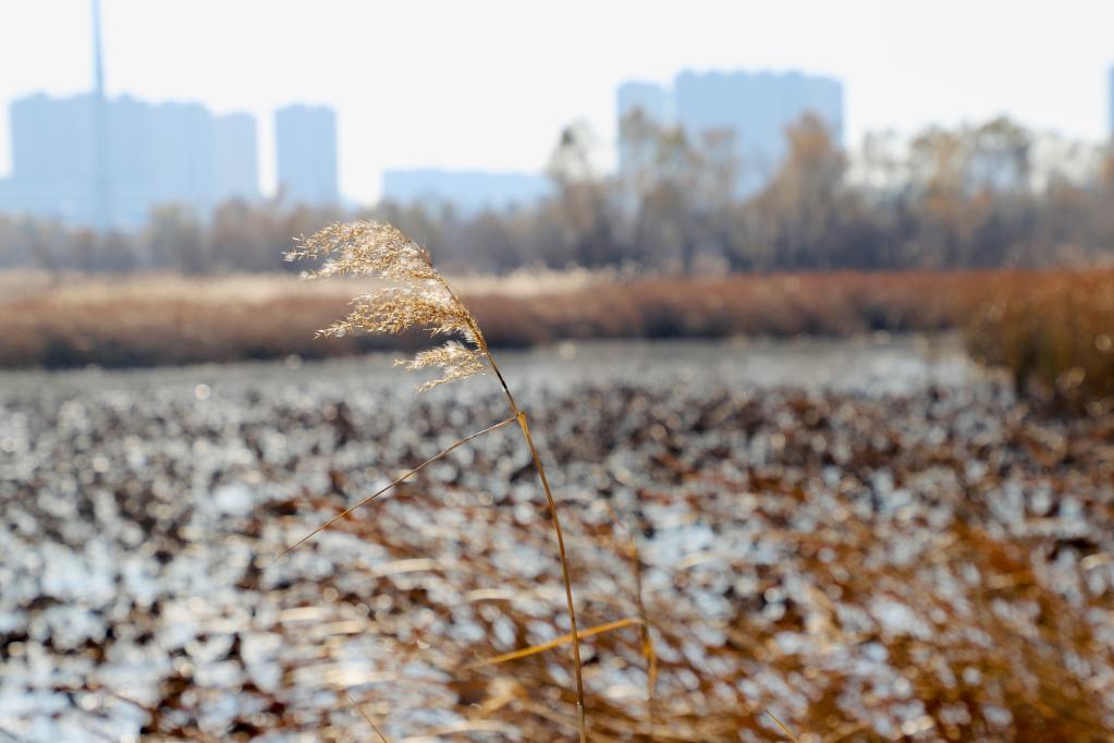 立冬時(shí)節(jié),登上哈爾濱松浦大橋,在下橋口順臺(tái)階而下,映入眼簾的是大片金黃色的蘆葦蕩,白色蘆花點(diǎn)綴其中迎風(fēng)招展,透過澄澈的水面依稀可見水草和水藻。在位于哈爾濱市松花江北面的阿勒錦島國家濕地公園,不少市民來這里徒步、騎行、健身,公園每年接待游客量超40萬人次。