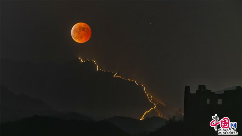 11月8日,月全食(紅月亮)天象驚艷亮相金山嶺長(zhǎng)城。(紀(jì)正權(quán) 張愛東