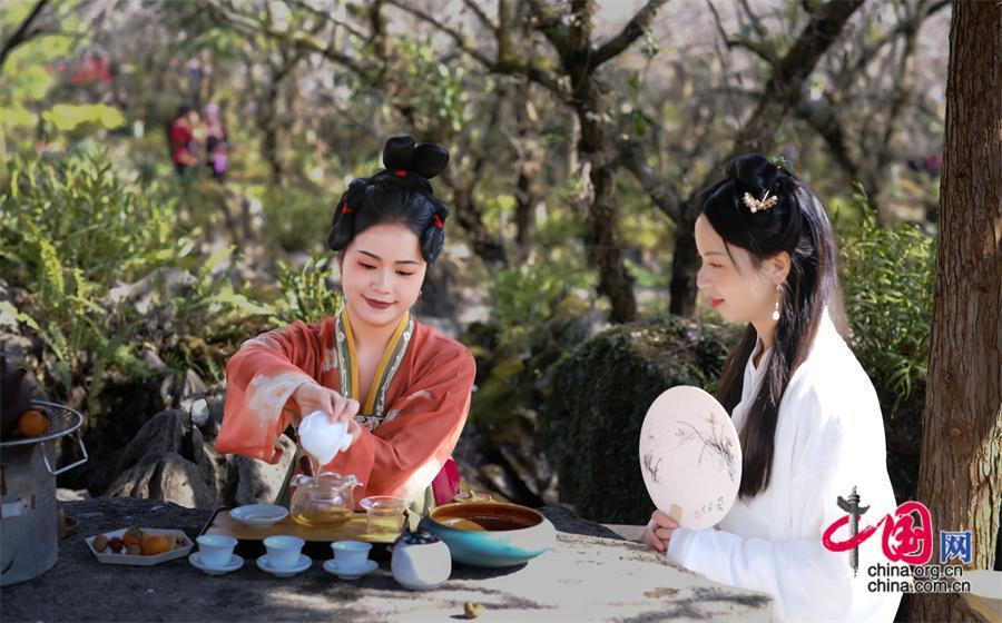 一朵梅花寓五福,一山梅花賀新春。梅原里,游客們或賞花祈福、或獨自品溫,或拍照打卡,盡情享受賞梅樂趣。還有不少游客,為了應景,更是穿著古風漢服或少數民族服飾,沉浸式打卡梅花節(jié),游客林女士說:“古裝配梅花,清麗脫俗,既感受到傳統(tǒng)文化之美,也為賞梅之旅增添了色彩。”