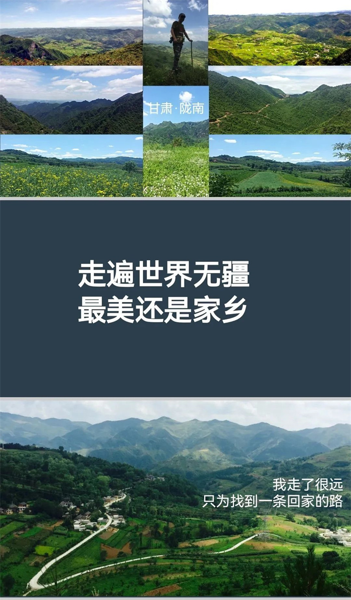 我每次回到西北各省區(qū)參加活動(dòng),做演講分享時(shí),總會(huì)放幾頁P(yáng)PT介紹我的家鄉(xiāng)——大隴南,配圖都是我拍攝的我們村莊附近的風(fēng)光,也經(jīng)常說一句話——“走遍世界無疆,最美還是家鄉(xiāng)”,不辭長作隴南人。