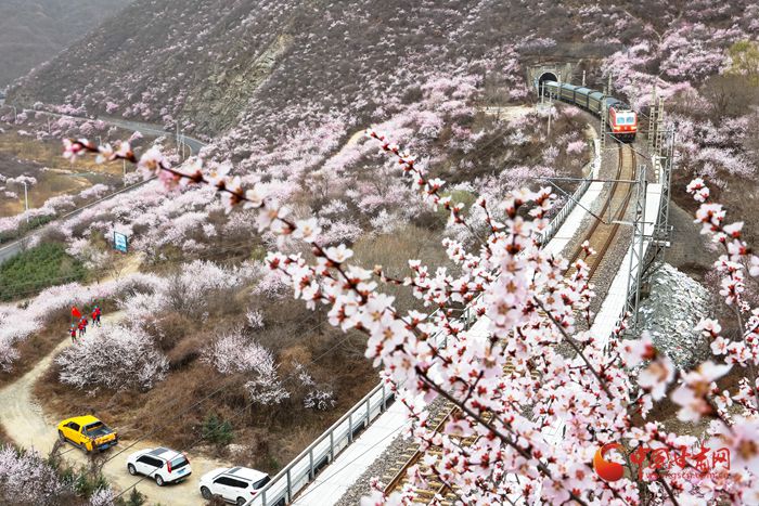 陽春三月,桃之夭夭。在崇信縣的漫山遍野上,朵朵桃花迎來盛放期。微風(fēng)吹來,暗香浮動。近看,朵朵嬌俏的桃花層層疊疊,錯落有致。遠看,漫山紅遍如霞似錦,爛漫壯觀。特別是一列列火車穿行而過,與桃花撞了個滿懷,奔向充滿希望的春天。
