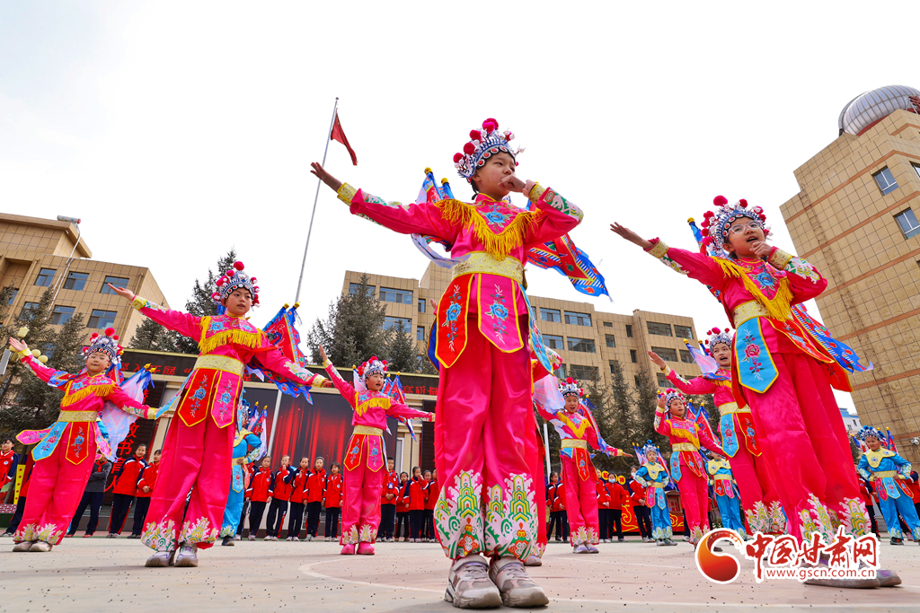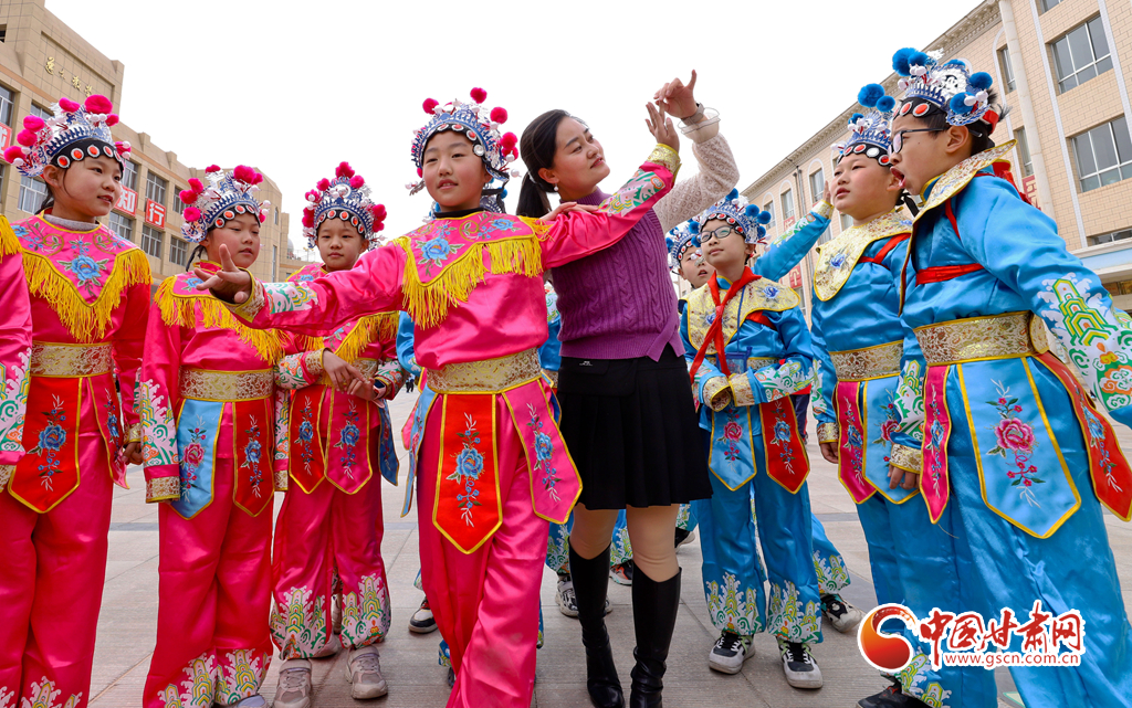 3月22日,在甘肅省張掖市民樂(lè)縣洪水小學(xué),戲曲演員正在給同學(xué)們指導(dǎo)戲曲動(dòng)作、傳授唱腔。
