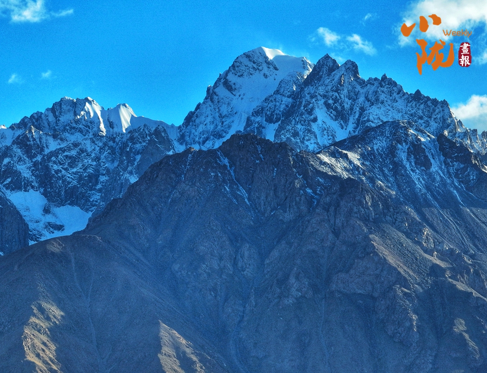 山頂白雪皚皚,熠熠生輝,裸露的山骨終年積雪不化;山下樹綠花開,青山碧水,風景如畫。