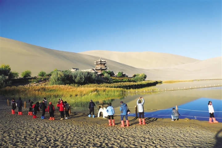敦煌市文旅部門統(tǒng)計(jì)數(shù)據(jù)顯示,10月7日以來(lái),鳴沙山·月牙泉景區(qū)日均接待游客近萬(wàn)人。