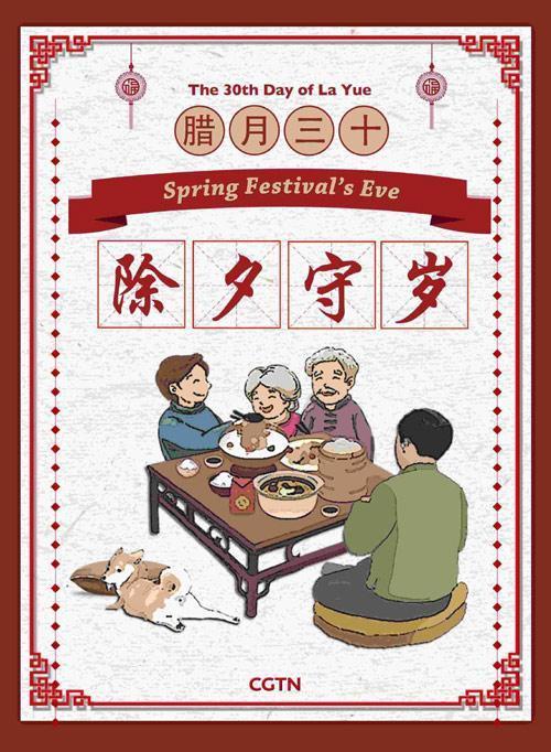 全家人一邊觀看春節(jié)晚會一邊享用盛大晚餐。人們會熬夜等待新年鐘聲敲響。餃子是必吃的食物。老人會給小孩發(fā)紅包。