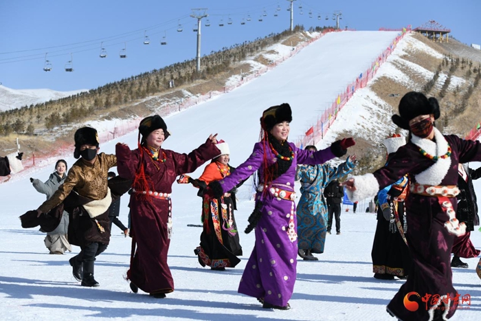 銀裝素裹的“冰雪嘉年華”現(xiàn)場(chǎng),來(lái)自當(dāng)?shù)氐母刹咳罕娚碇?jié)日的盛裝和游客們一起,隨著音樂(lè)的旋律,跳起了鍋莊。游玩區(qū),大人小孩參與其間,體驗(yàn)雙板滑雪、雪圈、雪地自行車(chē)等多種娛樂(lè)項(xiàng)目,歡聲笑語(yǔ)彌漫著整個(gè)雪場(chǎng)。