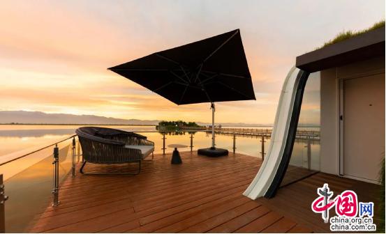 還有地球倉,與賀蘭山隔湖相望,超廣角的落地窗,猶如一個畫框,把房間外的風(fēng)景都放進(jìn)了畫框里。與其他不同的是,白天可將房間內(nèi)的自動升降床上升至房頂,露出隱藏在床底的沙發(fā)和茶桌,臥室即可秒變“會客茶室”。