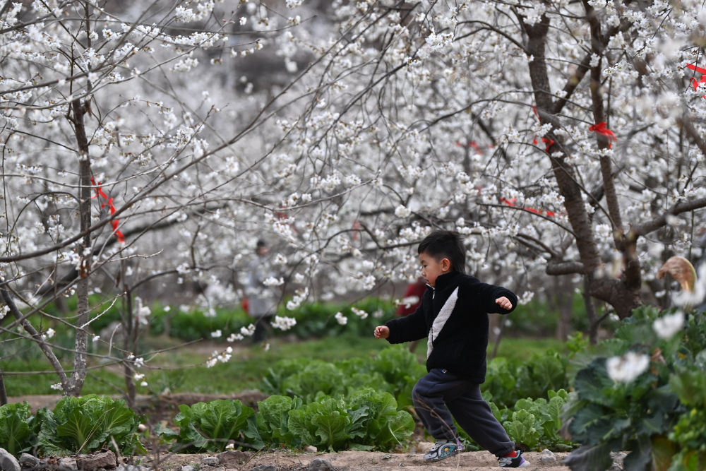 3月9日,一名小朋友在隴南市武都區(qū)城關(guān)鎮(zhèn)石家莊村的櫻桃樹下玩耍。新華社記者 陳斌 攝