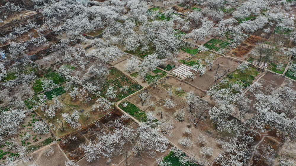 這是3月9日在隴南市武都區(qū)城關(guān)鎮(zhèn)石家莊村拍攝的櫻桃花(無人機(jī)照片)。 新華社記者 陳斌 攝