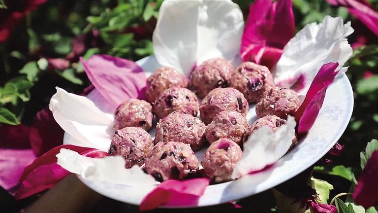 牡丹花肉丸,鮮香軟糯,做法不難。采摘新鮮的牡丹花,取花瓣用清水洗凈,選取肥瘦相間的羊肉剁成肉泥,和入切碎的牡丹花瓣,加入適量調(diào)料充分?jǐn)嚢枞嗄蟪赏枳?,裝盤入鍋蒸20分鐘左右即可。熱氣騰騰的牡丹花肉丸,花香伴著肉香,由不得人大快朵頤。