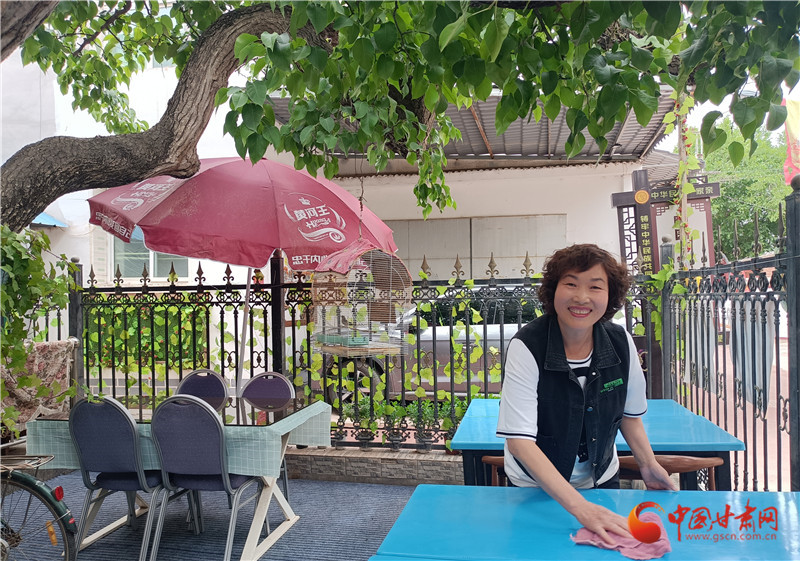 在梨園掩映中,上車(chē)村村民彭霞清家的小院安靜美好。進(jìn)入六月,梨園也進(jìn)入一年當(dāng)中生命力最旺盛的時(shí)節(jié),遮天蔽日的掩蓋讓這里成為蘭州人避暑的絕佳選擇,彭霞清也正在為即將到來(lái)的避暑旺季做準(zhǔn)備。