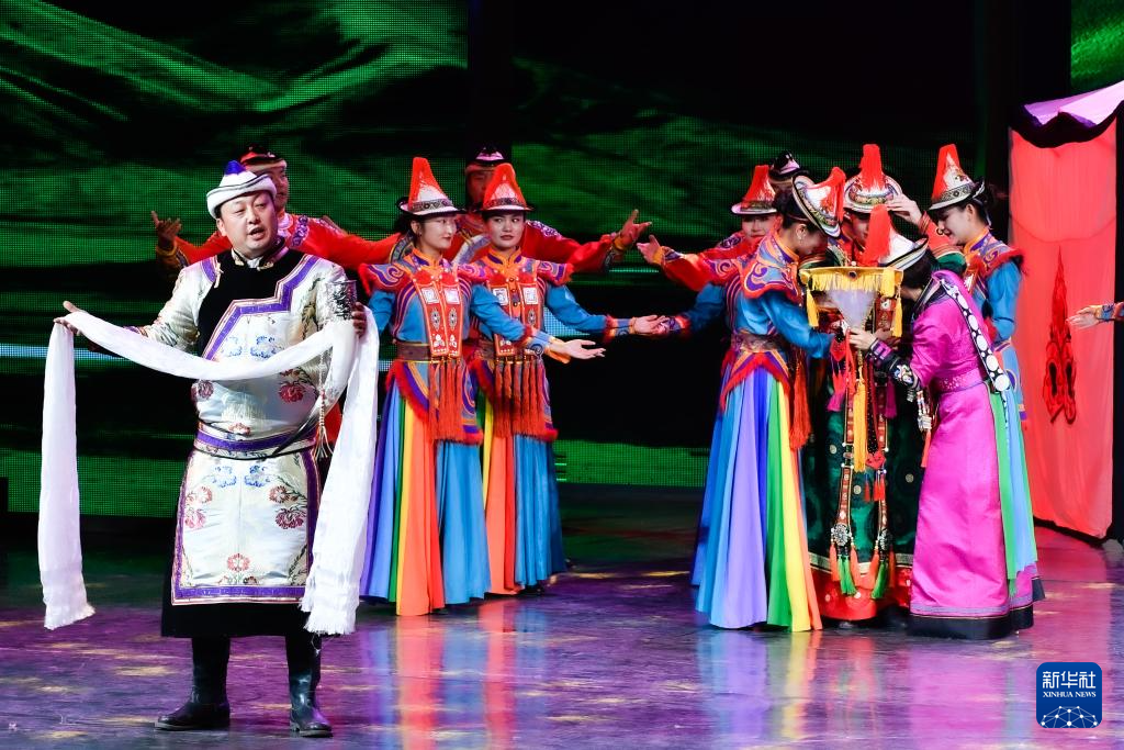 7月12日,張掖市肅南縣非物質文化遺產(chǎn)保護傳承中心演員表演國家級非遺代表性項目裕固族婚俗。新華社記者 郎兵兵 攝