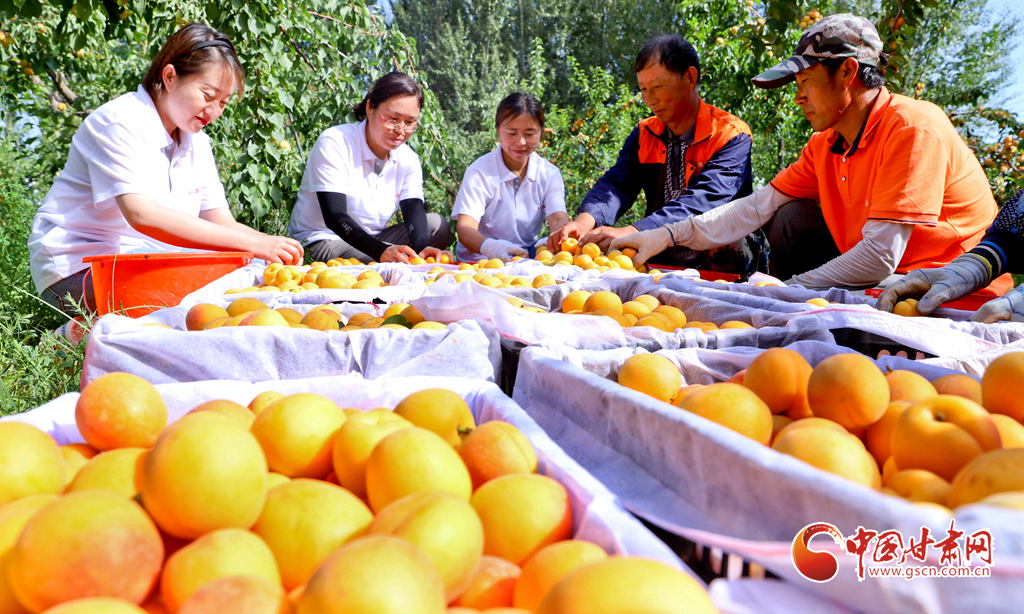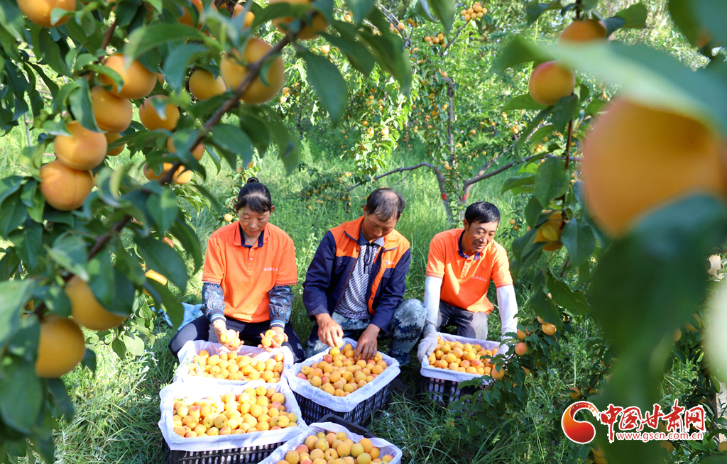 7月15日,甘肅省張掖市甘州區(qū)一專業(yè)合作社的特色林果種植基地內(nèi),金黃色的杏梅掛滿了枝頭,工作人員正在采摘成熟的杏梅。
