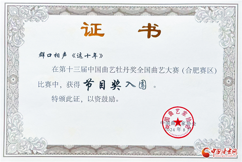 據(jù)了解,中國曲藝牡丹獎(jiǎng),是全國性曲藝藝術(shù)專業(yè)最高獎(jiǎng)項(xiàng)。第十三屆中國曲藝牡丹獎(jiǎng)全國曲藝大賽(合肥賽區(qū)),由中國文學(xué)藝術(shù)界聯(lián)合會(huì)、中國曲藝家協(xié)會(huì)、安徽省文化和旅游廳、安徽省文學(xué)藝術(shù)界聯(lián)合會(huì)、合肥市人民政府主辦,于8月18日至23日舉辦,是本屆牡丹獎(jiǎng)四個(gè)分賽區(qū)中的最后一站,主要面向相聲、小品、“三書”類節(jié)目。中國曲協(xié)18家團(tuán)體會(huì)員、中國曲協(xié)香港會(huì)員分會(huì)、中國曲協(xié)有關(guān)專業(yè)委員會(huì)、中直文藝院團(tuán)以及省級(jí)文藝院團(tuán)報(bào)送的節(jié)目參賽。期間,共收到480多個(gè)節(jié)目,48個(gè)節(jié)目入圍,《這十年》為甘肅地區(qū)唯一一件入圍作品。