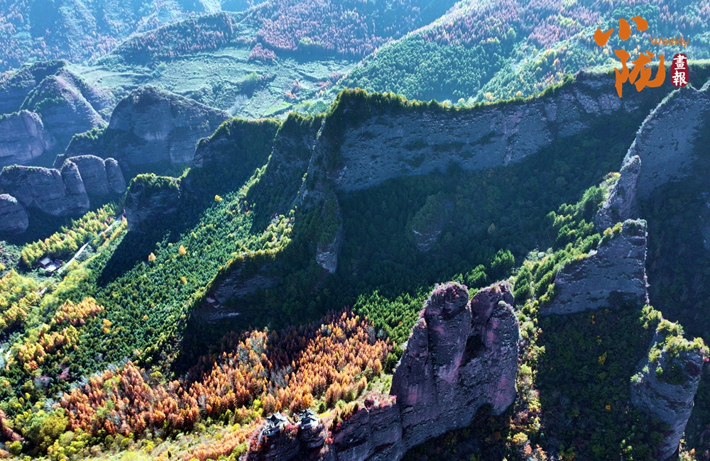 站在山頂,俯瞰四野,山勢挺拔,直插云霄,山巒被紅、黃、橙、綠各種顏色渲染,盡顯山巒疊翠之美。
