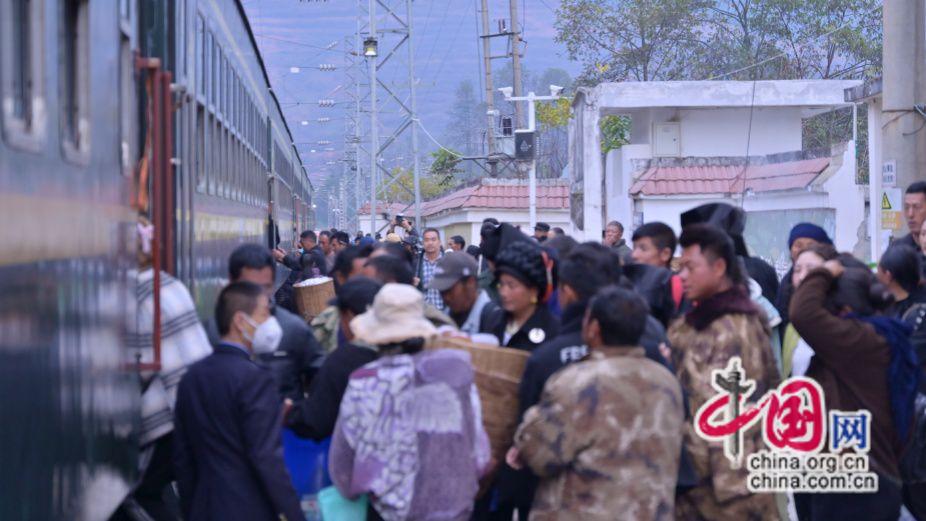 2024年11月20日,彝歷新年第一天,成昆線5633次慢火車??吭谡九_,彝族同胞有序乘車。原波 攝