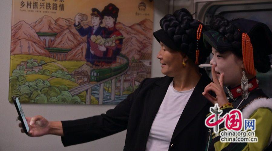 沿途,每當(dāng)列車??吭谲囌镜却臅r間,彝族老鄉(xiāng)在鐵路工作人員的協(xié)同配合下搬起水果,牽起牛羊,抱起雞鴨放進(jìn)一節(jié)節(jié)行李車廂上,慢火車的貨架上擺滿了農(nóng)產(chǎn)品。車廂里,人們互相交談,圍坐在一起放聲歌唱,好不熱鬧,歡樂的聲音從車廂內(nèi)傳出,像是在向廣袤的山川大地宣告著彝歷新年的盛事。