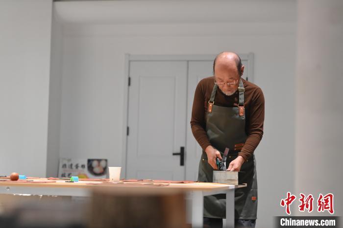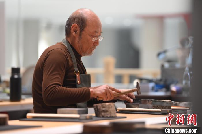 11月23日,甘肅省蘭州市楊樹珍剪紙工作室內,工匠名師劉金碌制作剪紙漢服作品的金屬帽邊。中新社記者 李亞龍 攝
