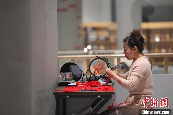 11月23日,甘肅省蘭州市楊樹珍剪紙工作室內,楊樹珍制作剪紙漢服。中新社記者 李亞龍 攝