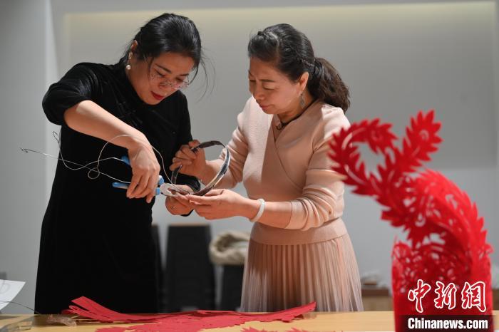 11月23日,甘肅省蘭州市楊樹珍剪紙工作室內,楊樹珍(左)帶領團隊成員制作剪紙漢服。中新社記者 李亞龍 攝