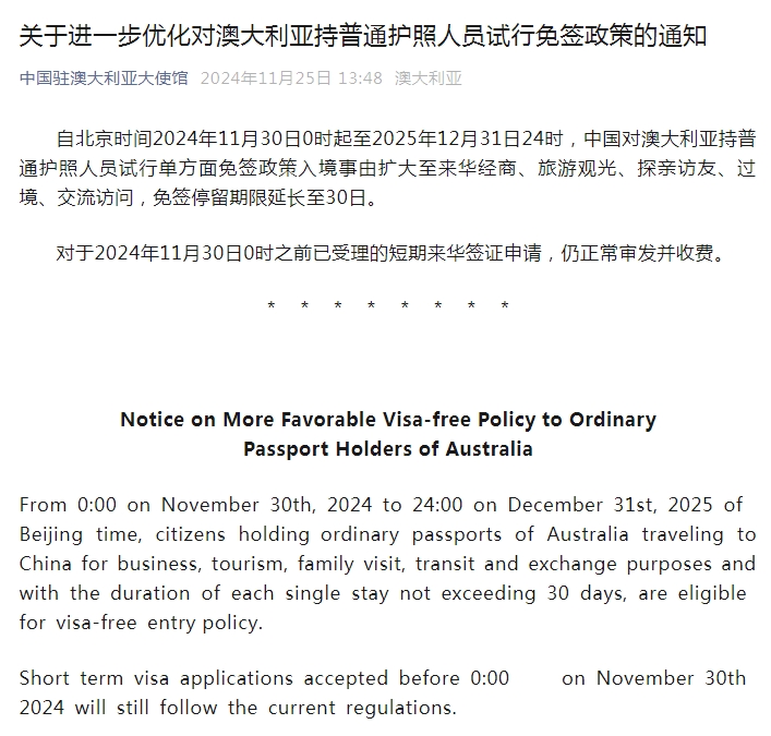 據(jù)“中國(guó)駐澳大利亞大使館”微信公眾號(hào)消息,自北京時(shí)間2024年11月30日0時(shí)起至2025年12月31日24時(shí),中國(guó)對(duì)澳大利亞持普通護(hù)照人員試行單方面免簽政策入境事由擴(kuò)大至來(lái)華經(jīng)商、旅游觀光、探親訪友、過(guò)境、交流訪問(wèn),免簽停留期限延長(zhǎng)至30日。
