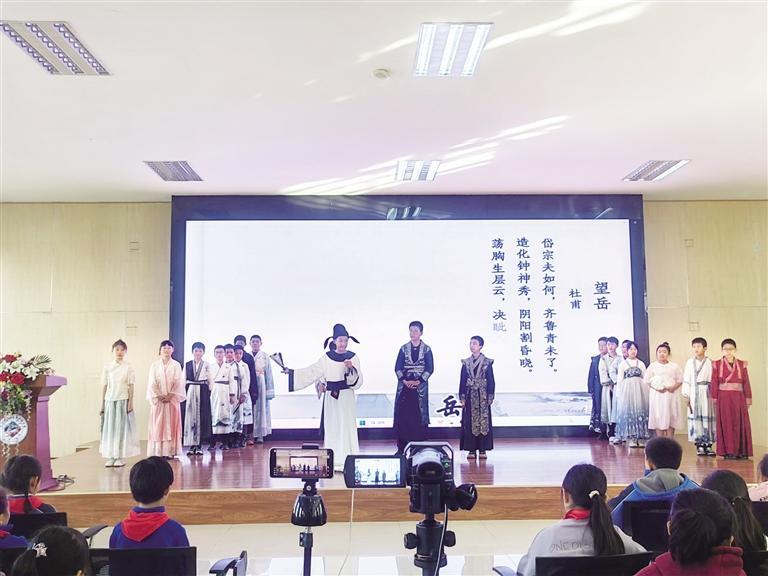 活動現(xiàn)場,燈光柔和,氛圍莊重而溫馨。舞臺上,教師與學(xué)生代表們身著古裝,仿佛將觀眾帶入了千年前的唐朝。他們的表演深情而投入,每一個動作、每一句臺詞都充滿了對杜甫及其時(shí)代的敬意。