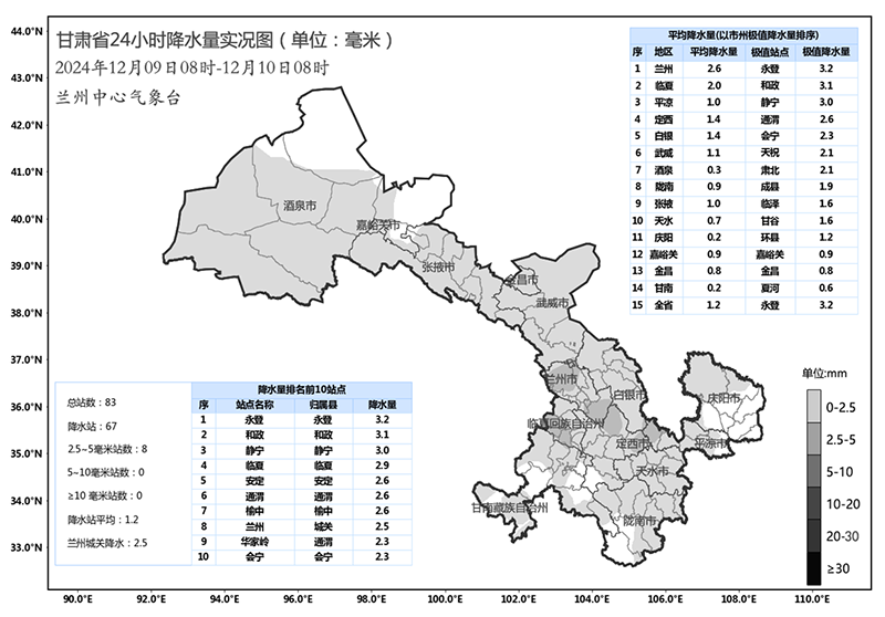 中國(guó)甘肅網(wǎng)12月10日訊(西北角·中國(guó)甘肅網(wǎng)記者 沈文剛)12月9日8時(shí)至12月10日8時(shí),全省共計(jì)67個(gè)縣區(qū)出現(xiàn)降雪,其中蘭州南部、臨夏南部、平?jīng)鑫鞑俊⒍ㄎ鳀|部局部地方出現(xiàn)中雪。目前,較大累積降雪量出現(xiàn)在永登3.2mm、和政3.1mm、靜寧3.0mm、臨夏2.9mm、通渭2.6mm。蘭州本站降水2.5mm。