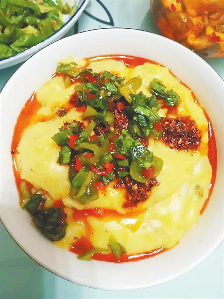 馓馓飯,要用新玉米面,今年新磨的,馓的飯才顏色亮,入口香。舊面就不行,咽口里,粗糙。燒半鍋水,水滾,翻白花。母親站鍋前,右手執(zhí)長(zhǎng)筷,在鍋里攪,左手抓一把面,手指慢慢蠕動(dòng),滑潤(rùn)的玉米面在指縫里,均勻地落下去,水上面一層細(xì)密的泡。一直攪,一直撒面,筷子不能停,停了便凝成面疙瘩。這時(shí)候,火要旺,火一小,就生了。最好是木柴火,火勢(shì)大,有后勁,茂盛的火苗才能伸著紅舌頭舔著黑鍋底。母親說,“人心要實(shí),火心要虛。”鍋面上,熱氣騰騰。白霧氣從廚房門涌出,像白馬,翻四蹄,跑進(jìn)了落著雪花的天上去。