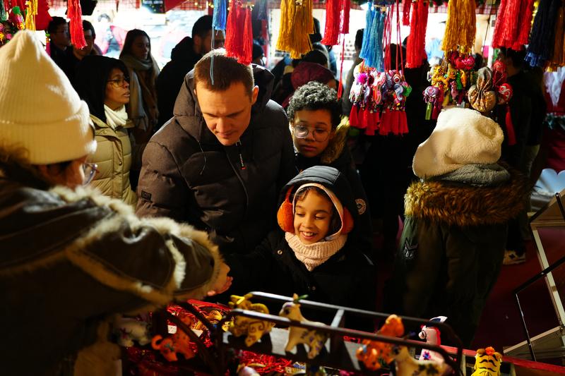 (法國(guó)巴黎圣誕集市慶陽(yáng)香包展位上,一位外國(guó)友人正在購(gòu)買心儀的“虎頭枕”香包。)