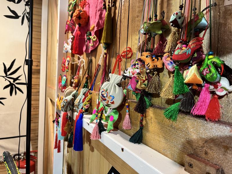 (法國(guó)巴黎圣誕集市慶陽(yáng)香包展位上懸掛的各式各樣香包。)