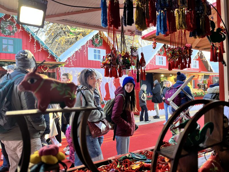 (法國(guó)巴黎圣誕集市慶陽(yáng)香包展位前,志愿者正在為外國(guó)友人熱心介紹不同香包的寓意與功能。)