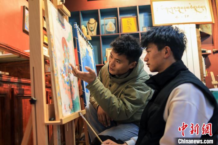 四川省甘孜藏族自治州理塘縣勒通古鎮(zhèn),是一個融合了特色傳統(tǒng)文化和現(xiàn)代創(chuàng)新的重要旅游目的地。近年來,理塘縣強化地域特色文化的保護,并引導當?shù)鼐用翊蛟炝艘幌盗刑厣幕糜涡马椖?。唐卡、皮具工藝、藏文書法及土陶制作等傳統(tǒng)工藝項目不僅得到了保護,還吸引了大量游客前來觀賞和交流。圖為12月22日,在勒通古鎮(zhèn)的“唐卡館”,畫師昂旺登登(左)指導洛絨曲扎繪制唐卡。中新社記者 王磊 攝
