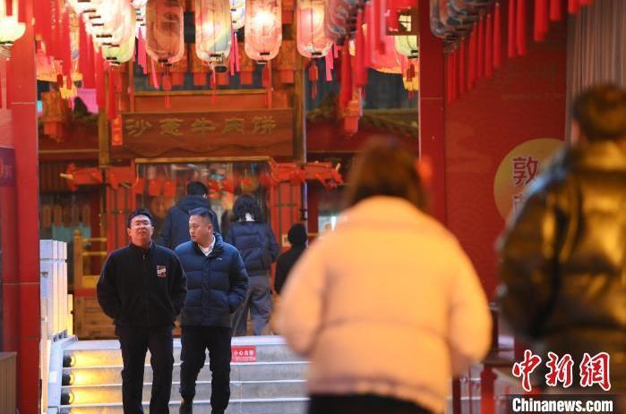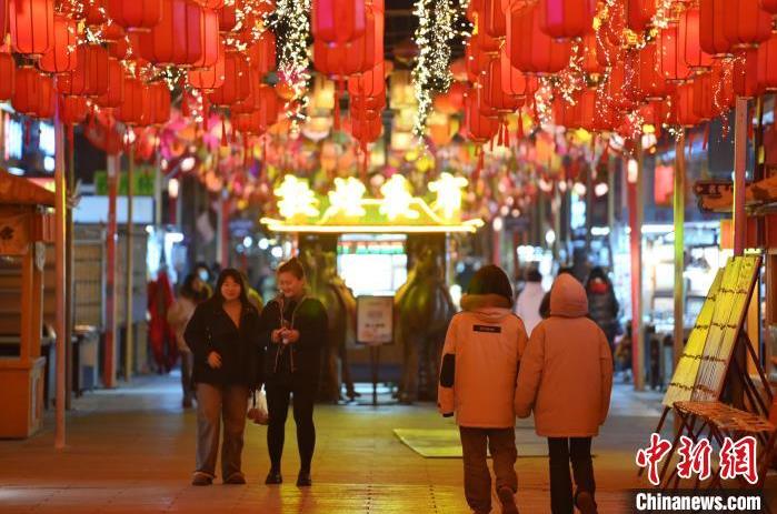 1月13日晚,甘肅敦煌夜市內(nèi),游人感受新春燈飾。據(jù)了解,從2024年12月1日至2025年2月28日,當?shù)伉Q沙山月牙泉、玉門關、敦煌雅丹世界地質(zhì)公園等景區(qū)對國內(nèi)外所有游客免門票,莫高窟門票實行半價優(yōu)惠,開放洞窟由8個增加至10個,為游客提供了更為豐富的觀賞內(nèi)容。中新社記者 李亞龍 攝