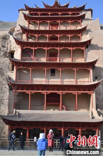 1月13日,甘肅敦煌莫高窟景區(qū)內(nèi),游人在莫高窟標志性建筑九層樓前拍照打卡。中新社記者 李亞龍 攝