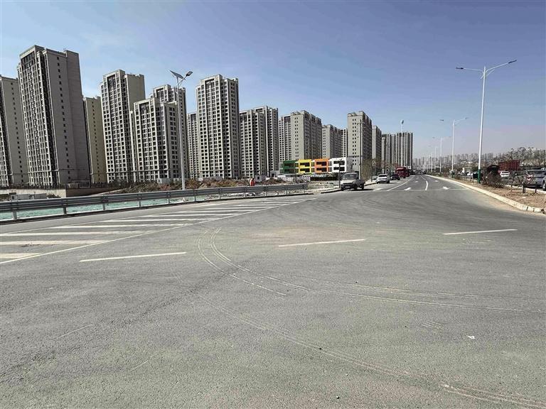 該項目起點接南河道橋,終點接雁兒灣路,道路全長約545米,根據(jù)路面情況,最寬處設(shè)計為雙向六車道,窄處設(shè)計為保障通暢的雙向兩車道。項目現(xiàn)場,挖掘機、壓路機正在配合工人完成路面平整、道牙安裝等工作,灑水車也一直在場內(nèi)作業(yè),確保揚塵管控做好“六個百分百”。