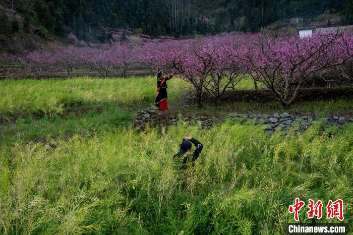 3月15日,在廣西田林縣浪平鎮(zhèn)浪平村,村民在桃樹下勞作。黃數(shù)情 攝