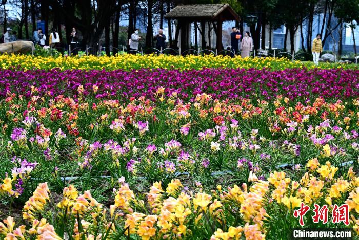 3月16日,游客在公園觀賞小蒼蘭。春日,福州花海公園魯冰花、小蒼蘭、油菜花等鮮花盛放,吸引了許多民眾前來(lái)漫步賞花,享受春天美好時(shí)光。中新社記者 張斌 攝
