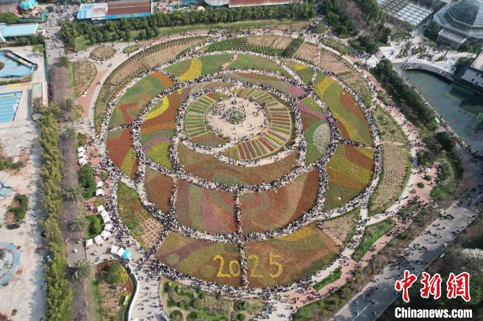 圖為游人來(lái)到巨型“玫瑰花型花海”中賞花。(無(wú)人機(jī)照片)中新社記者 楊華峰 攝