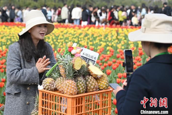圖為商戶在花叢中進(jìn)行直播帶貨賣(mài)鳳梨。中新社記者 楊華峰 攝