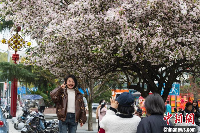 連日來(lái),四川省成都市雙流區(qū)棠湖公園的海棠花競(jìng)相綻放。纖細(xì)的花枝低垂,朵朵海棠嬌艷欲滴,散發(fā)著淡淡的芬芳,吸引市民紛至沓來(lái)。圖為3月16日,棠湖公園正大門(mén)處,垂絲海棠盛開(kāi),市民在此拍照打卡。韓金雨 攝