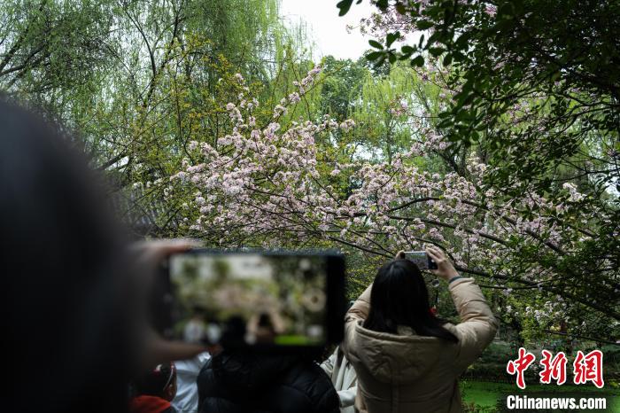 圖為3月16日,市民準(zhǔn)備在棠湖公園內(nèi)的海棠樹(shù)下自拍。韓金雨 攝